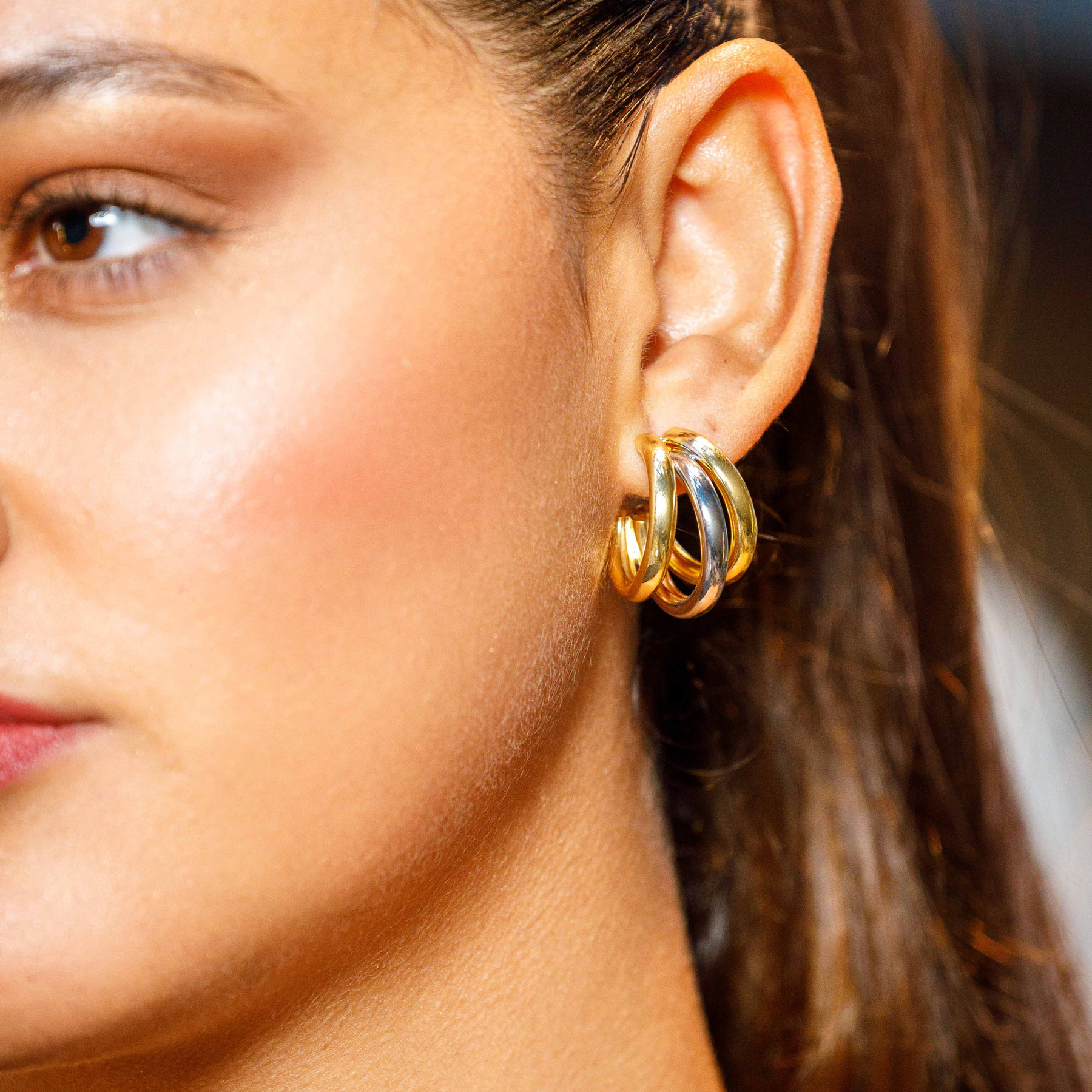 Argollas triples fantasía en color dorado y plata. Ideales para complementar tu look de fiesta o para uso en tu día a día.