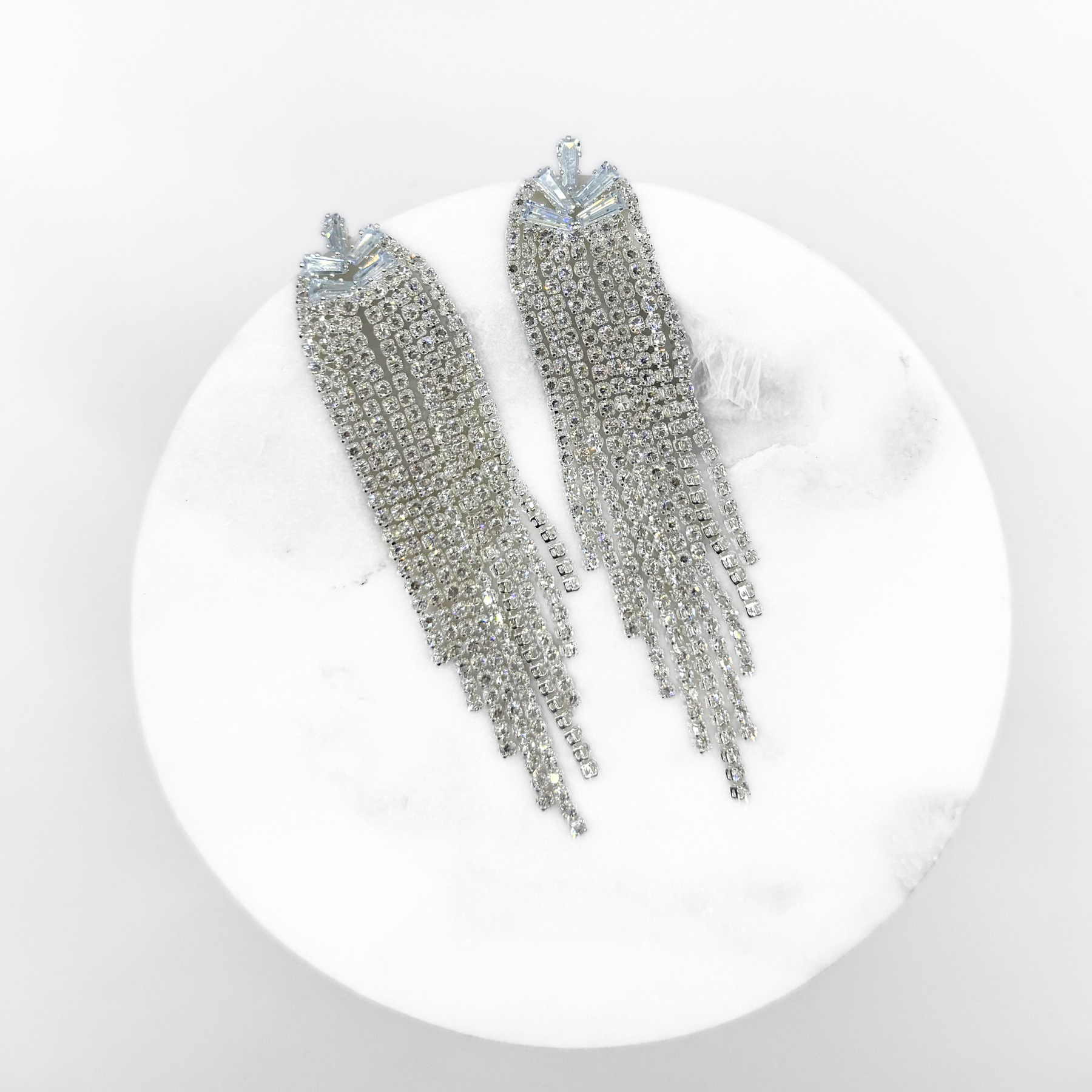 Aros de fiesta en Fantasía strass color plateado. Con un diseño inicial de zirconios rectangulares azul cielo y moderna terminación de strass colgante. Accesorio ideal para complementar looks de gala y fiesta.