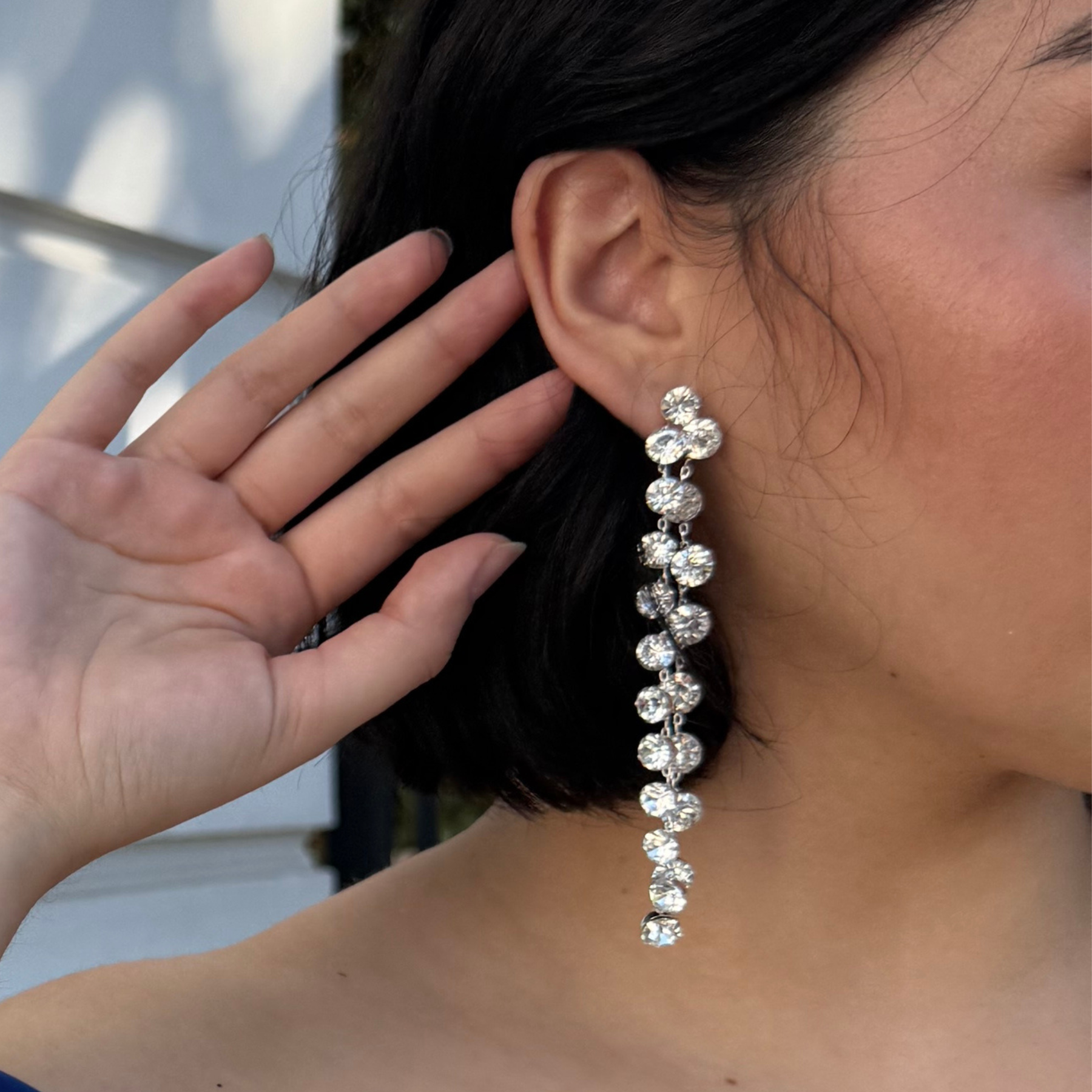 Aros largos de fiesta con diseño en cascada de cristales brillantes, montados en tono plateado. Su formato colgante estiliza el rostro y aporta luz inmediata, ideales para galas, matrimonios y eventos formales donde buscas un look elegante y sofisticado.