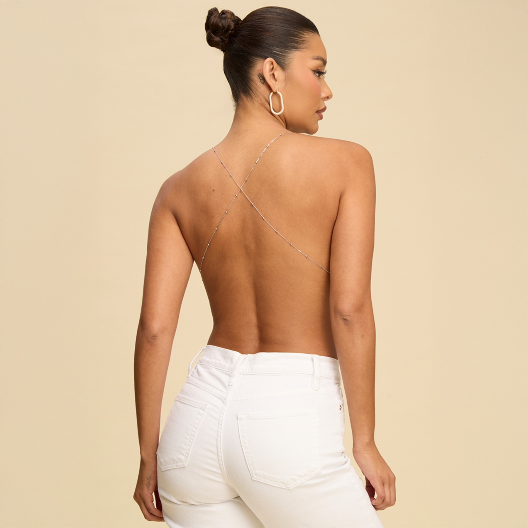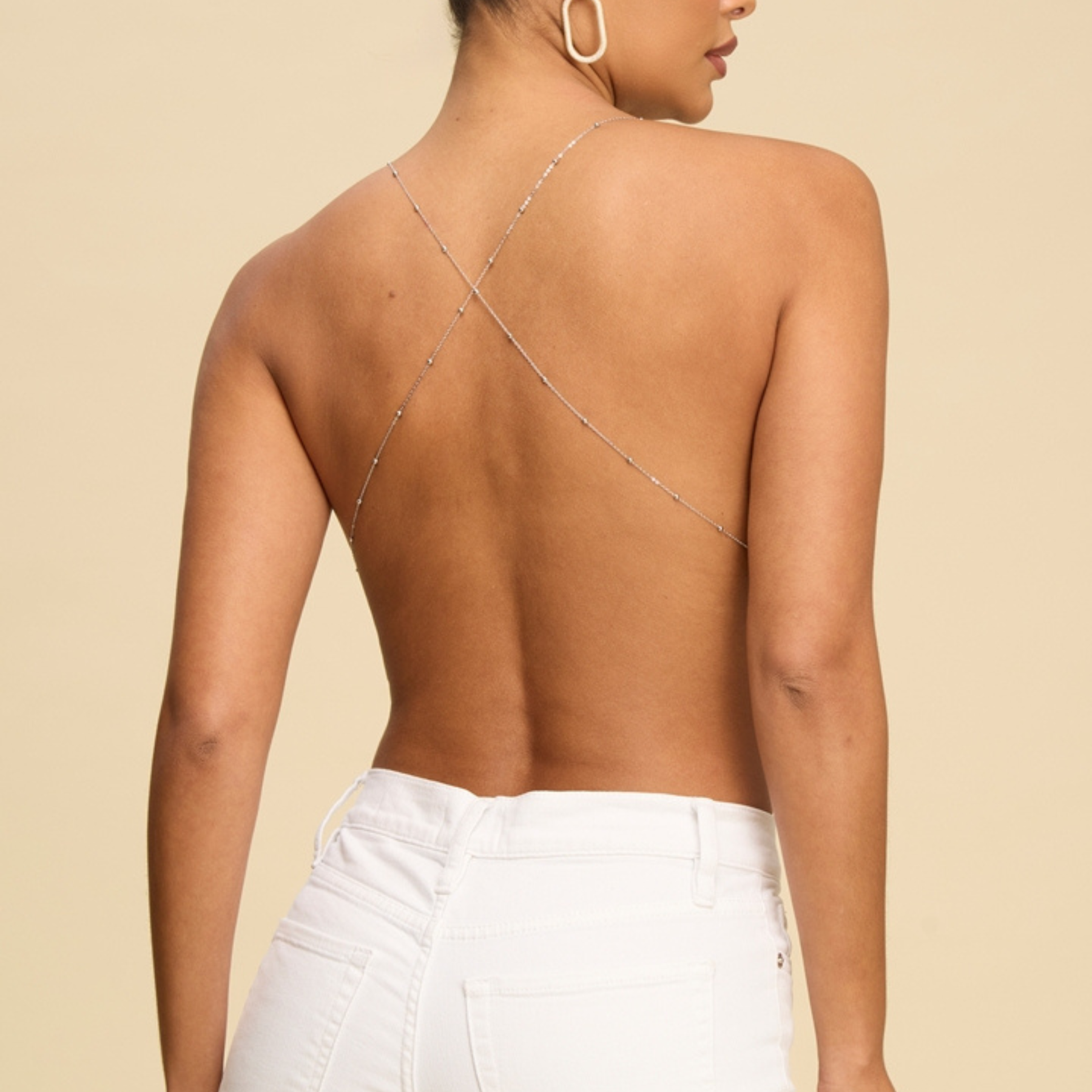 En la espalda, el diseño es completamente protagonista: espalda descubierta con tirantes finos cruzados, que dejan la espalda al descubierto de manera elegante y estilizada. Este detalle hace que el top se vea liviano, moderno y muy favorecedor desde todos los ángulos.