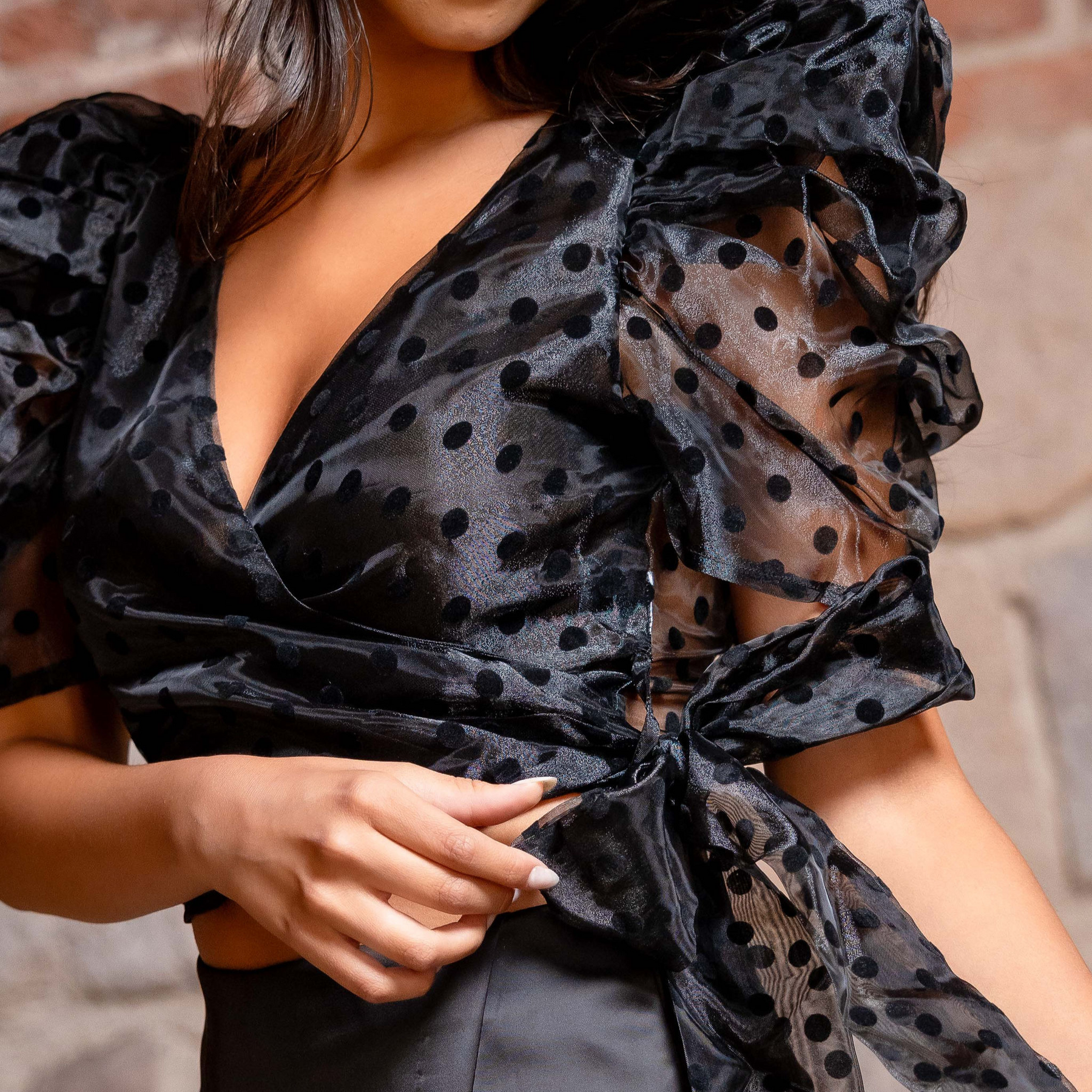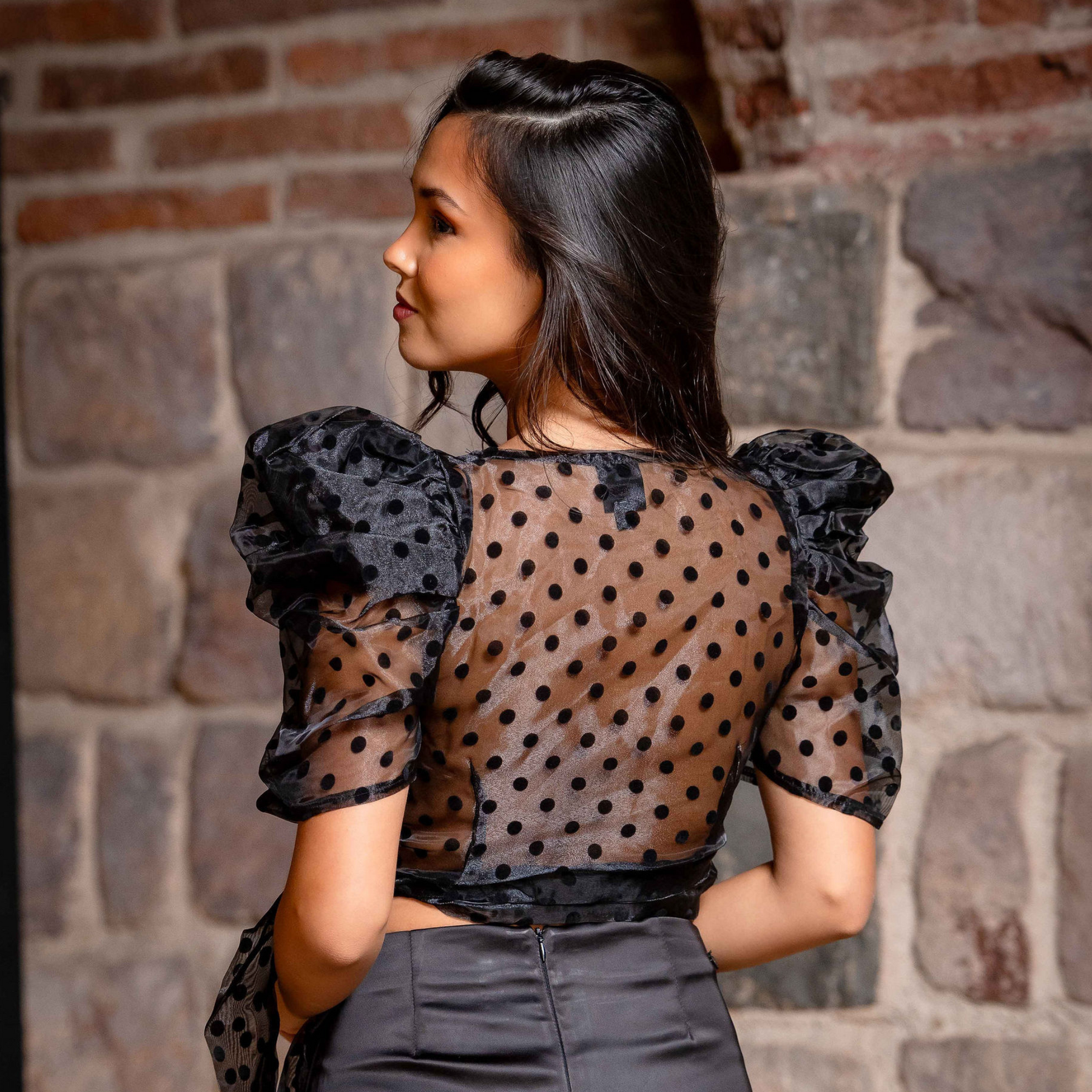 Eleva tu estilo con nuestro top de gasa con diseño de lunares, una prenda versátil que combina frescura y sofisticación. Sus mangas globo aportan volumen moderno, mientras que el escote en V y el ajuste envolvente estilizan tu silueta con elegancia.