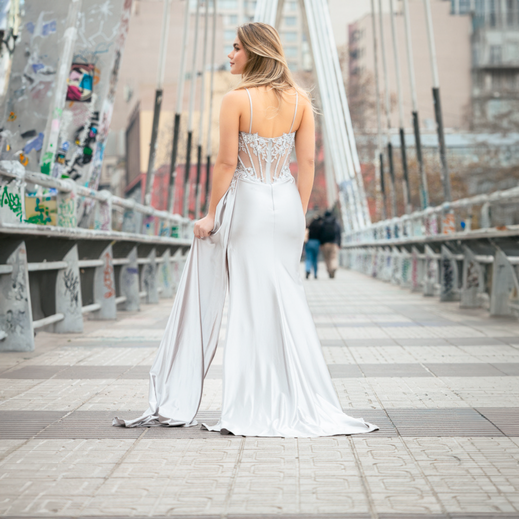 El vestido largo de fiesta plateado modelo Violeta es sinónimo de elegancia moderna y sensualidad. Su diseño incorpora un corset con transparencias y aplicaciones bordadas en pedrería, que define la silueta y aporta un aire glamuroso y sofisticado.
