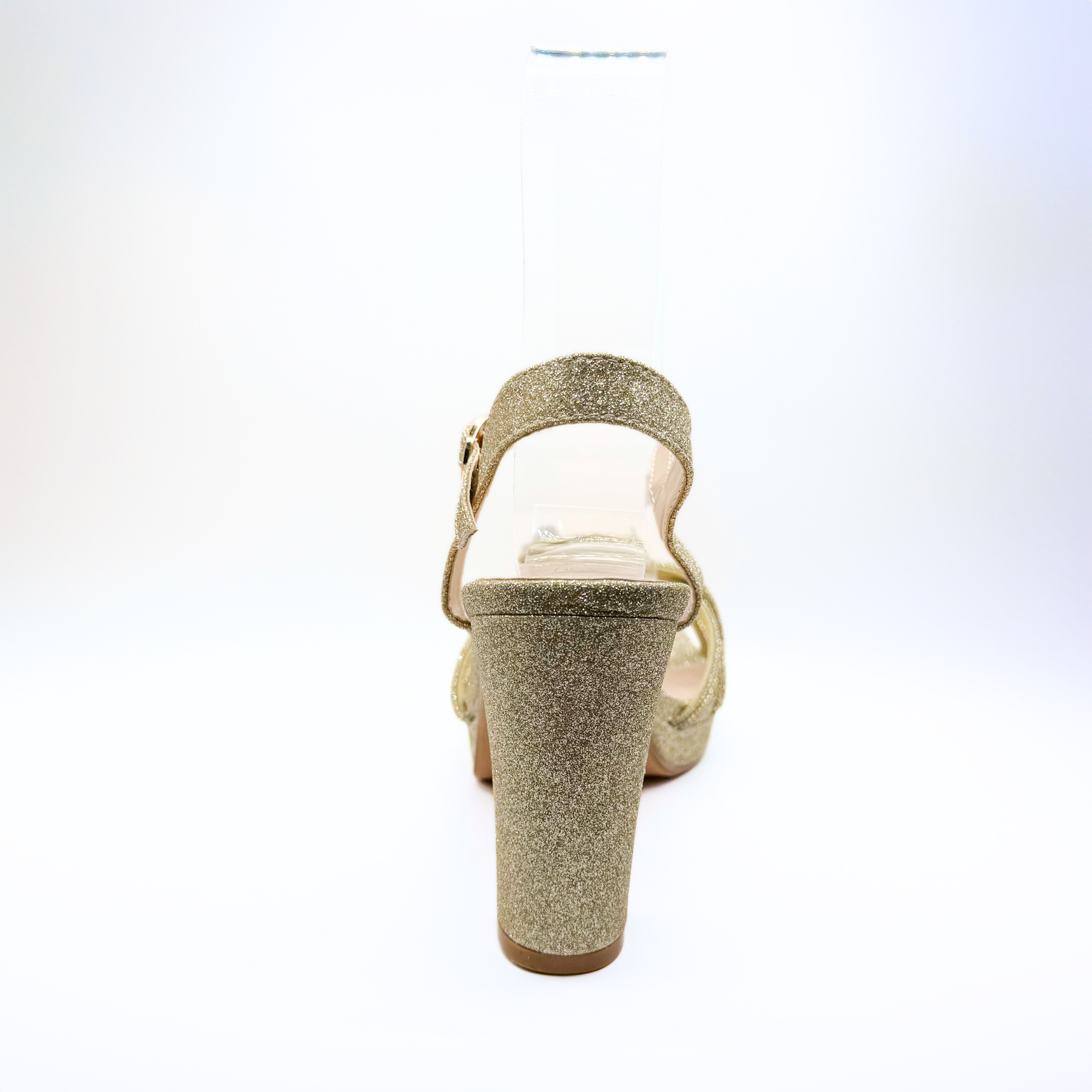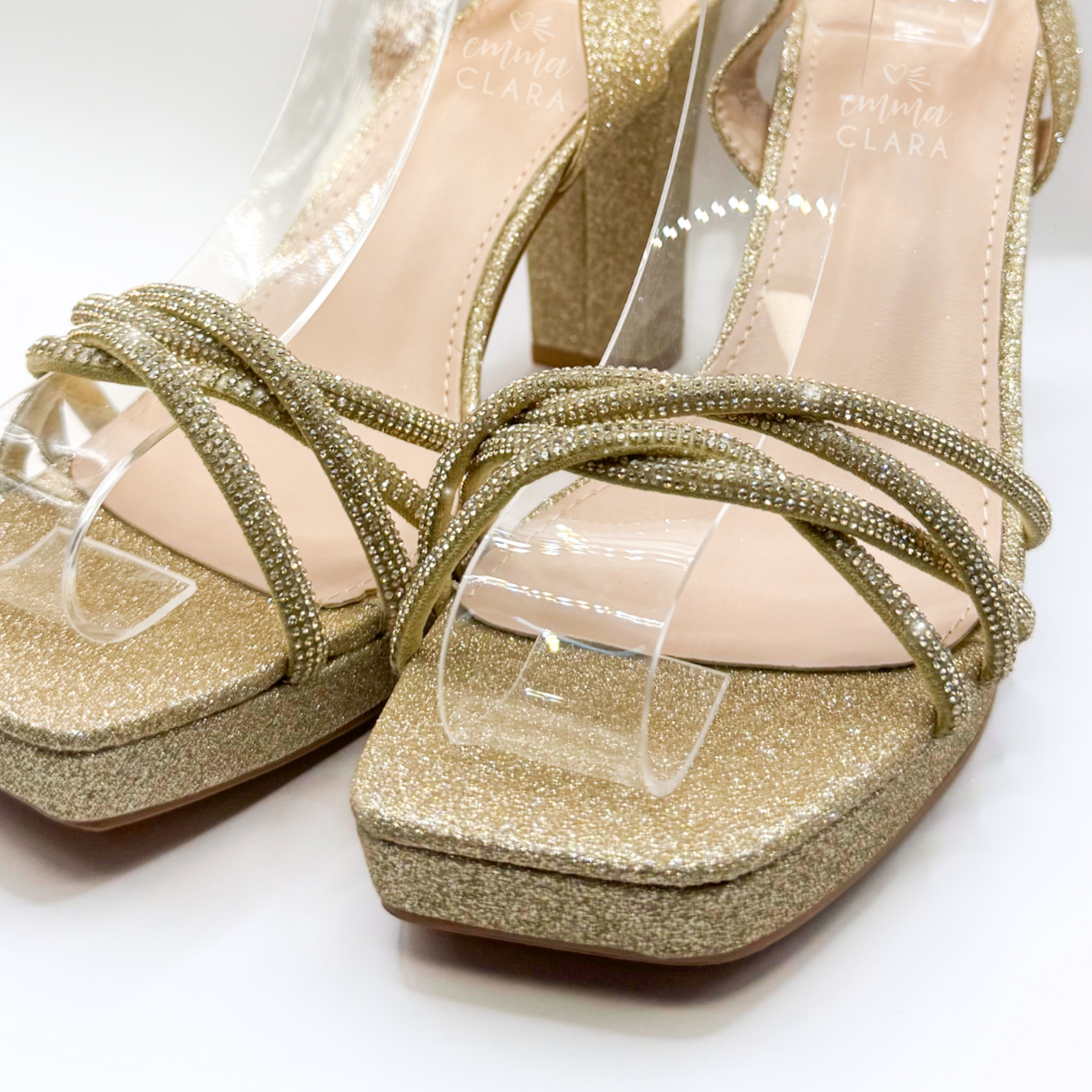 Este zapato de fiesta dorado con diseño en strass ofrece un equilibrio perfecto entre elegancia y comodidad gracias a su tacón mediano. Ideal para eventos de gala y matrimonios, su brillo sutil realza cualquier vestimenta, aportando sofisticación sin sacrificar estabilidad durante largas celebraciones.