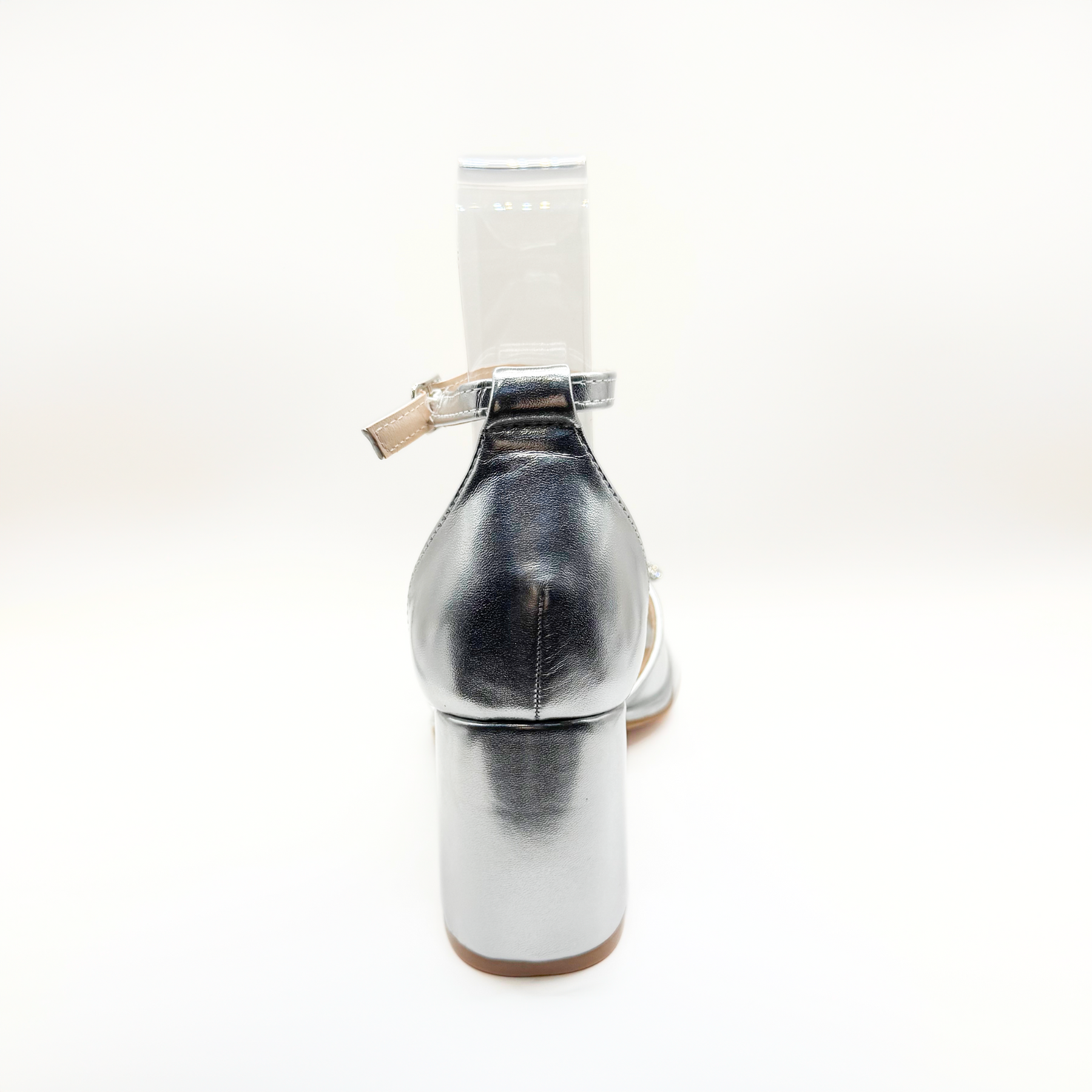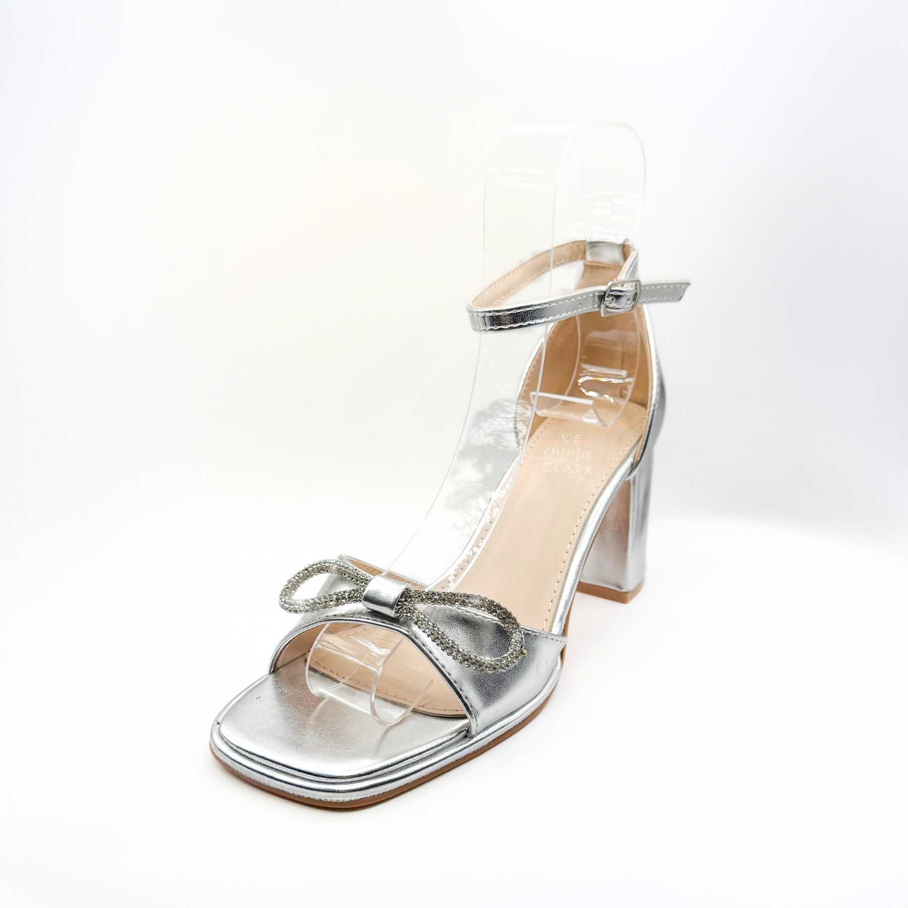 Luce sofisticación con estas sandalias de fiesta plateadas de Emma Clara. Su diseño destaca con un elegante lazo brillante en la parte frontal, taco ancho que aporta estabilidad y pulsera ajustable al tobillo para mayor comodidad.