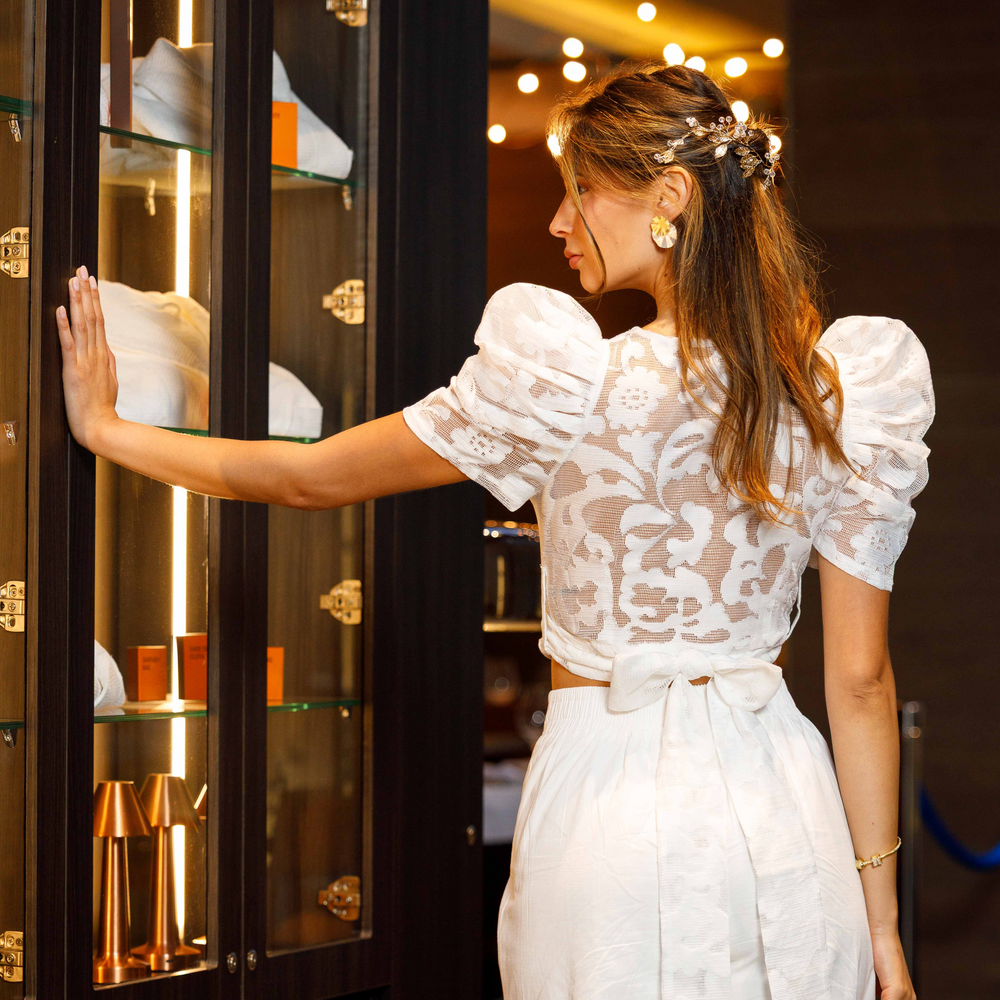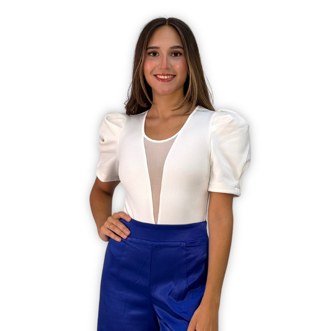 Top Manga Globo Escote en V Flores Ingrid Blanco
