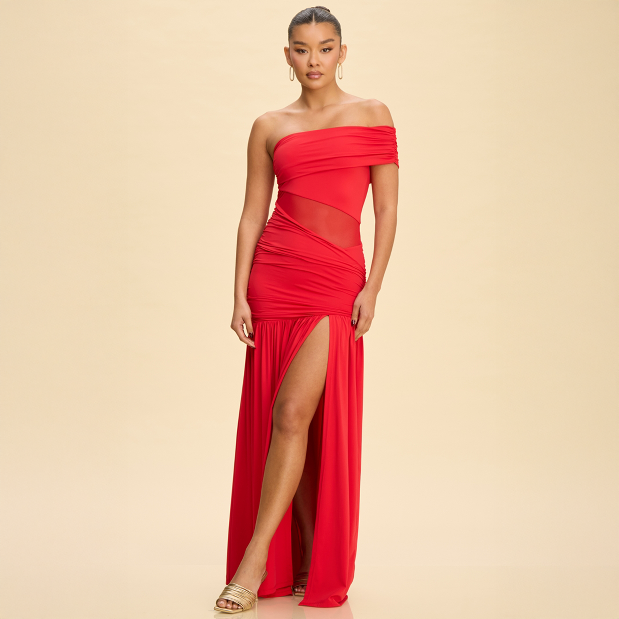 Vestido largo rojo con escote off shoulder Mika
