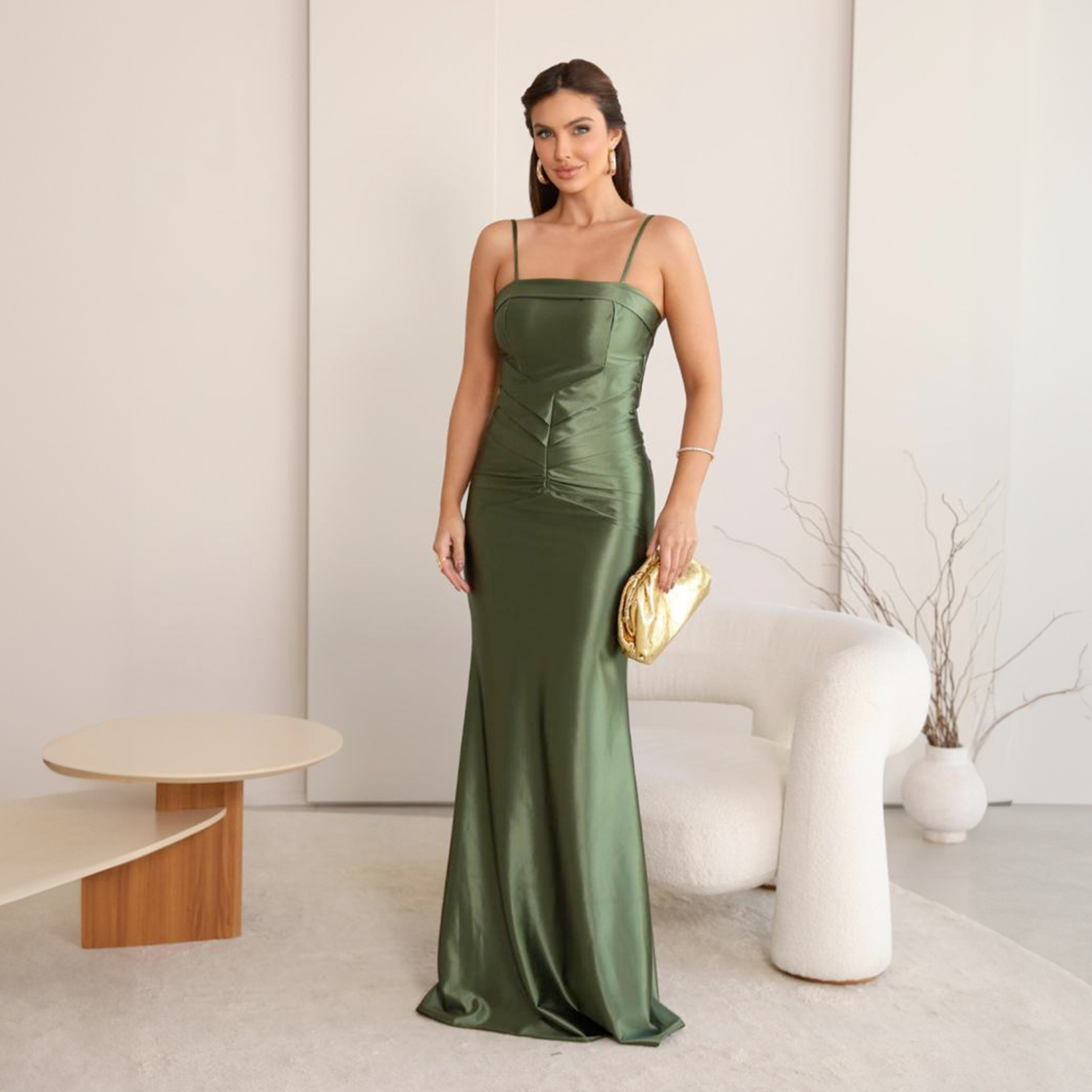 Look de Fiesta: Al retirar la capa, descubres un refinado vestido de tirantes finos con escote recto, perfecto para bailar con total libertad de movimiento sin perder el glamour.