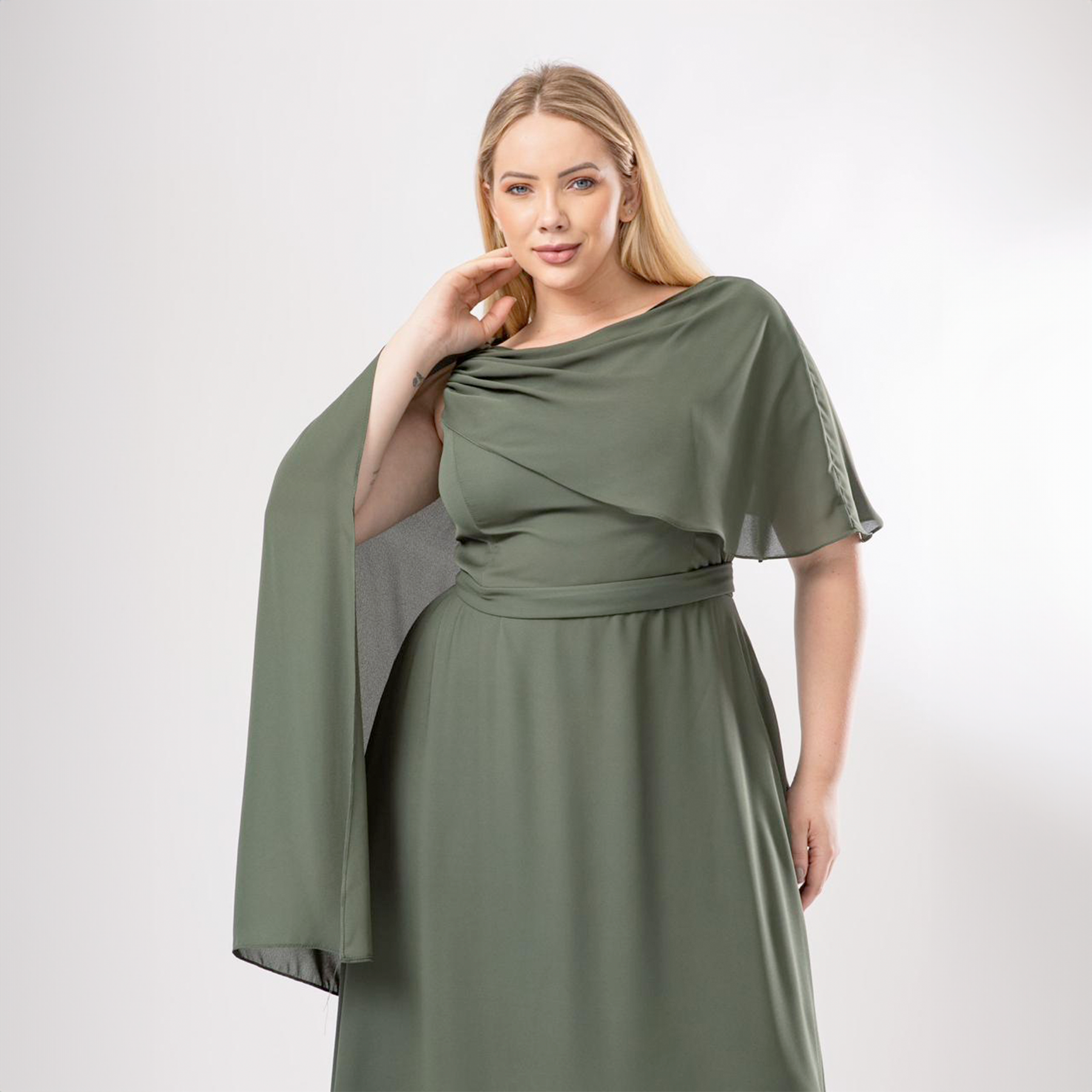 Este vestido de fiesta largo destaca por su diseño sofisticado y silueta favorecedora, ideal para matrimonios, galas y eventos formales. Su escote asimétrico con delicado drapeado aporta un toque elegante y estiliza la parte superior, mientras que la capa integrada cae suavemente desde los hombros, creando un efecto etéreo y distinguido.