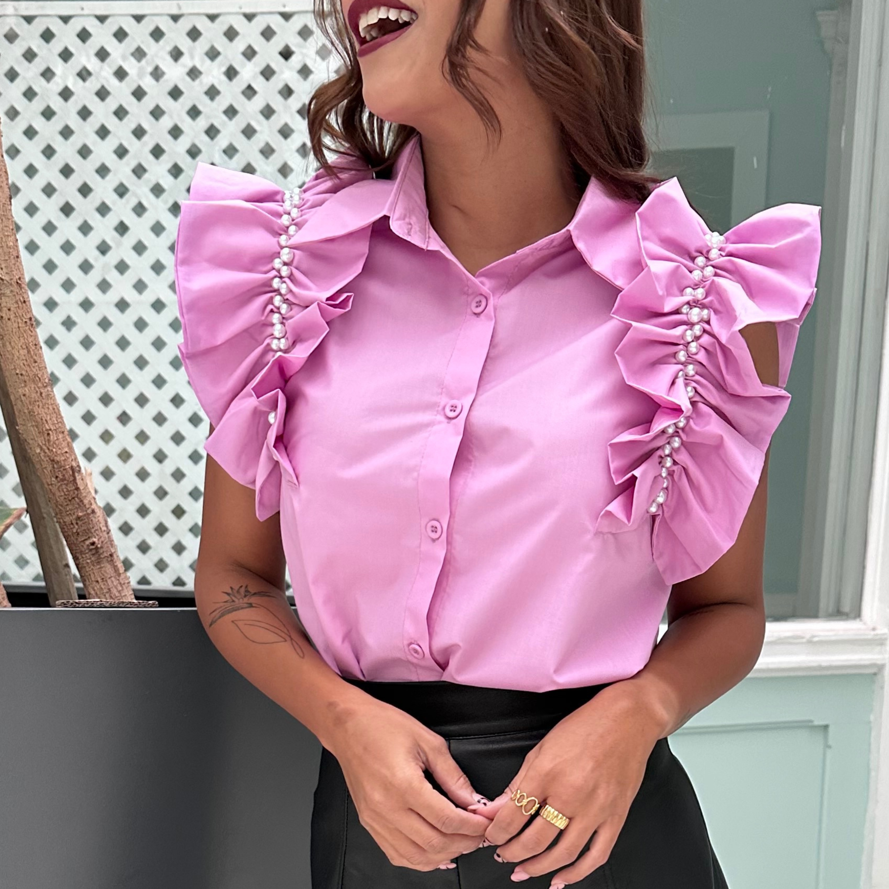 Blusa lila de diseño femenino y sofisticado, con delicados vuelos en los hombros y detalles de perlas que aportan un toque elegante y romántico. Ideal para elevar cualquier look, desde uno formal hasta un outfit más casual chic.