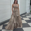 La falda en capas con volantes metálicos dorados crea movimiento y volumen, ideal para brillar en matrimonios, graduaciones o galas. Un vestido único para quienes buscan un look glamuroso, moderno y memorable.