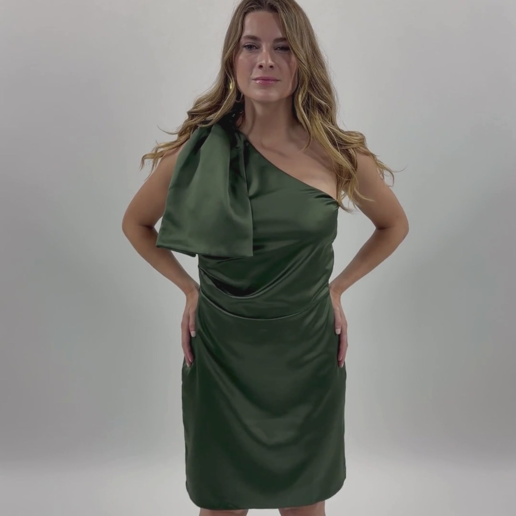 Vestido de fiesta asimétrico en satén verde olivo que combina elegancia y modernidad.