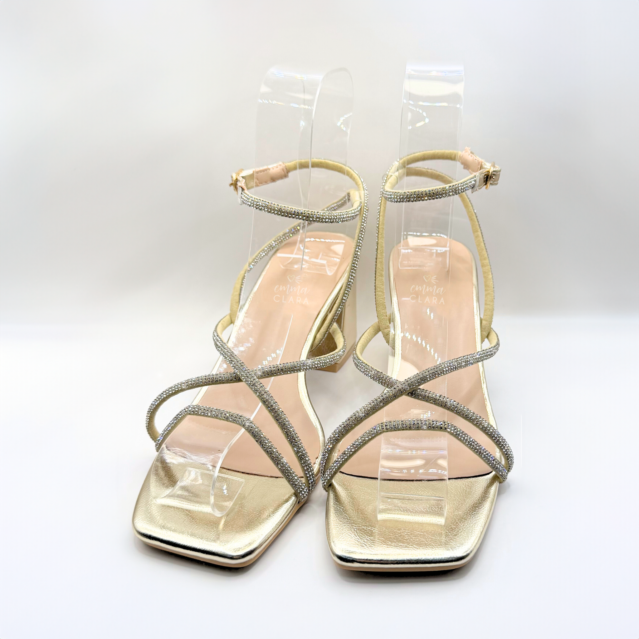 Brilla en cada ocasión con estas sandalias de fiesta doradas de Emma Clara. Su diseño con straps finas cruzadas y tacón ancho de altura media ofrece un equilibrio ideal entre elegancia y comodidad.